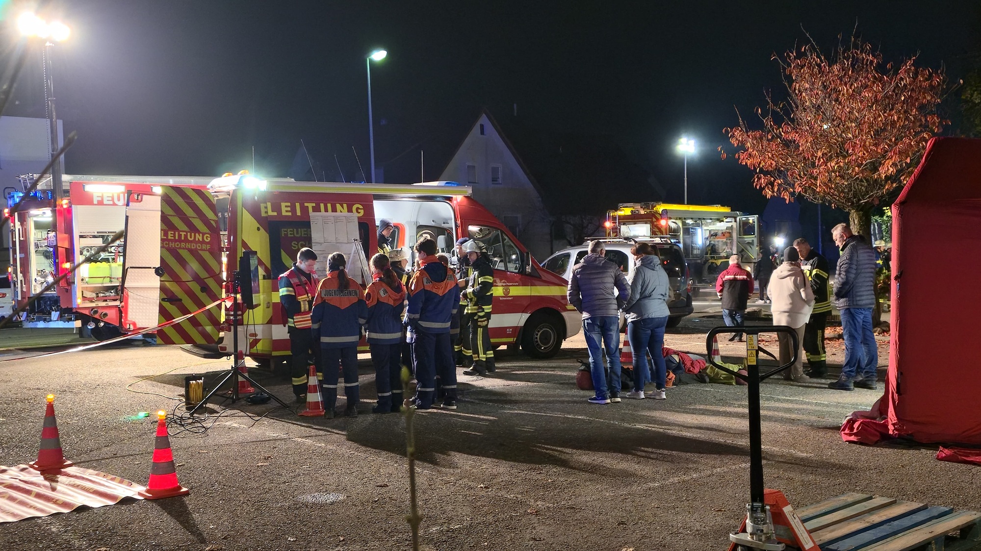Um schnell handeln zu können, wurden zwei Brandabschnitte gebildet. Insgesamt waren 35 Kameradinnen und Kameraden sowie 12 „vermisste“ Personen beteiligt. Unterstützt wurde die Führungsgruppe durch die Drohneneinheit, die mit moderner Technik für Übersicht und Sicherheit sorgte.