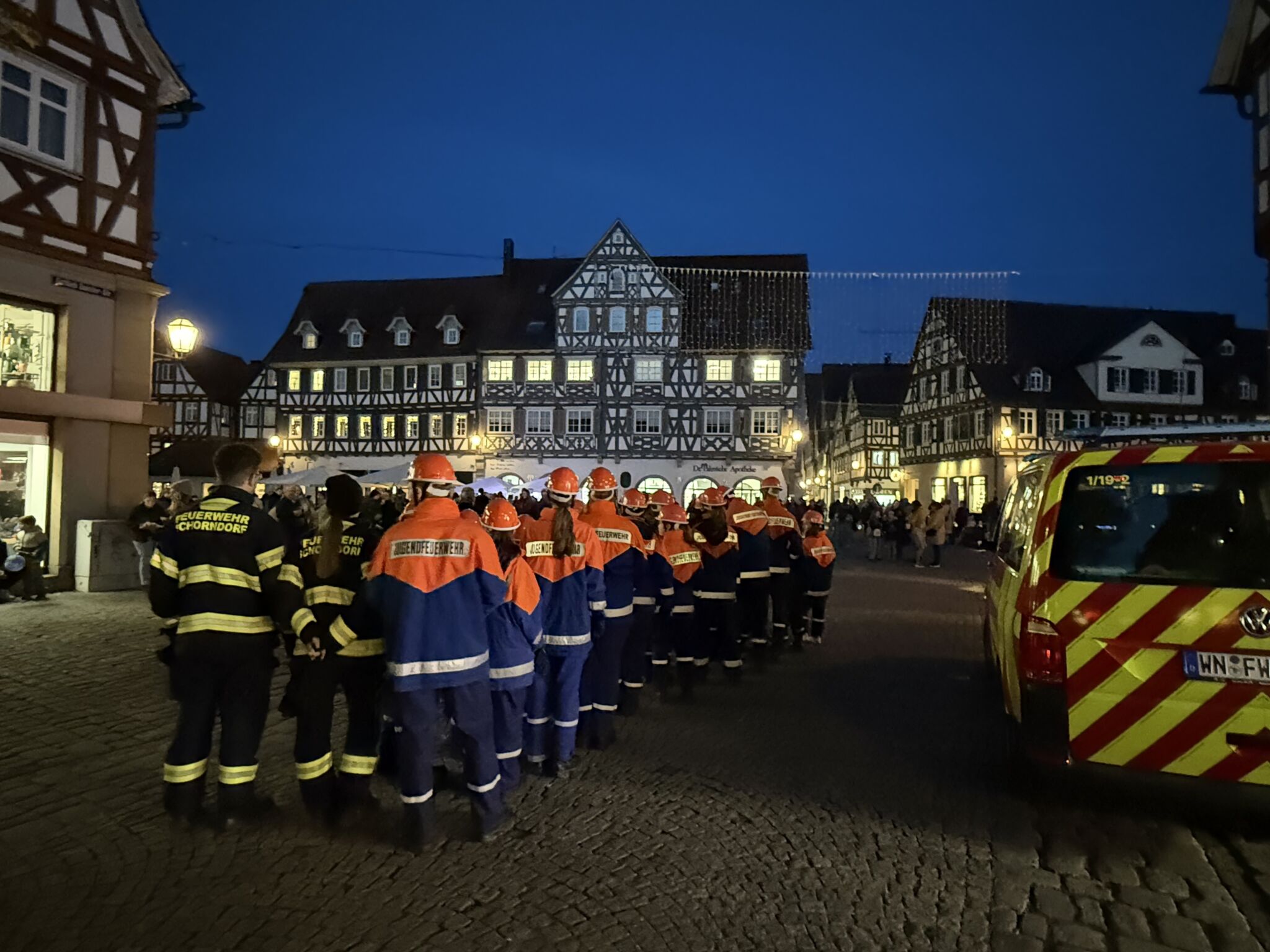 Viele Eltern waren mit ihren Kindern dabei, als die Jugendgruppe der Freiwilligen Feuerwehr Schorndorf, Abteilung Stadt, den Umzug vom Marktplatz über den Burgschloss-Park und zurück über die Höllgasse zum Marktplatz begleitete. Unterstützt von unserem MTW mit Blaulicht und musikalisch untermalt vom Jugend-Blasorchester Schorndorf erstrahlte die Stadt durch die Fackeln und Laternen der Kinder.