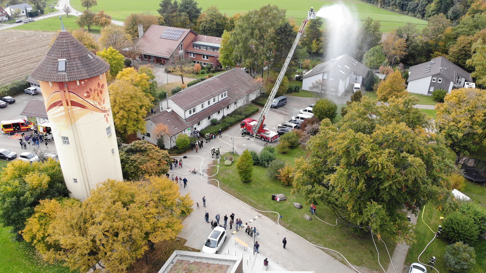 Es wurde ein Zimmerbrand in einem der Wohnhäuser angenommen, bei dem drei Bewohnerinnen der Fluchtweg aus dem Dachgeschoss abgeschnitten war. Dies ist ein realistisches Szenarium, das so auch zum Ernstfall werden kann.