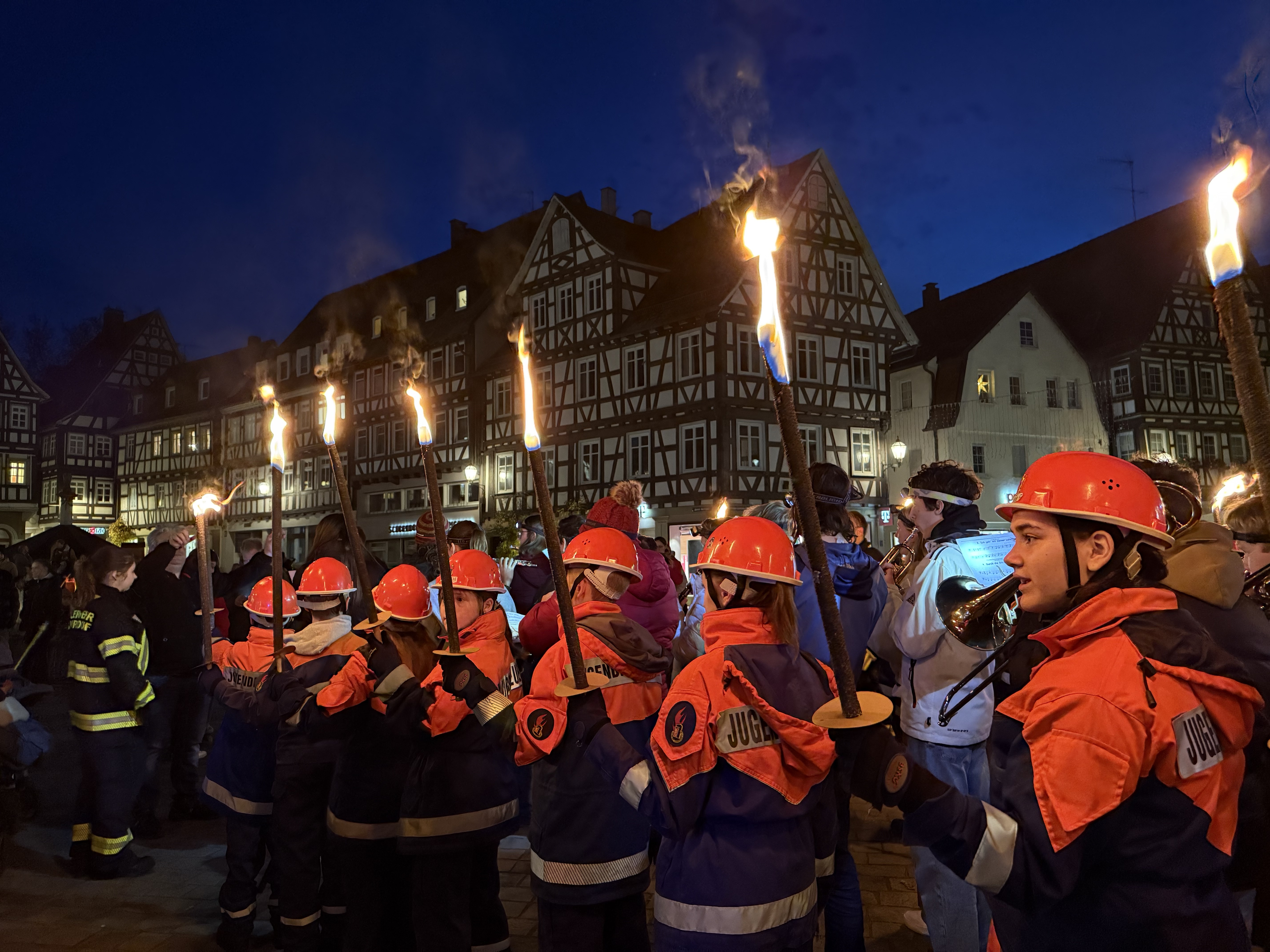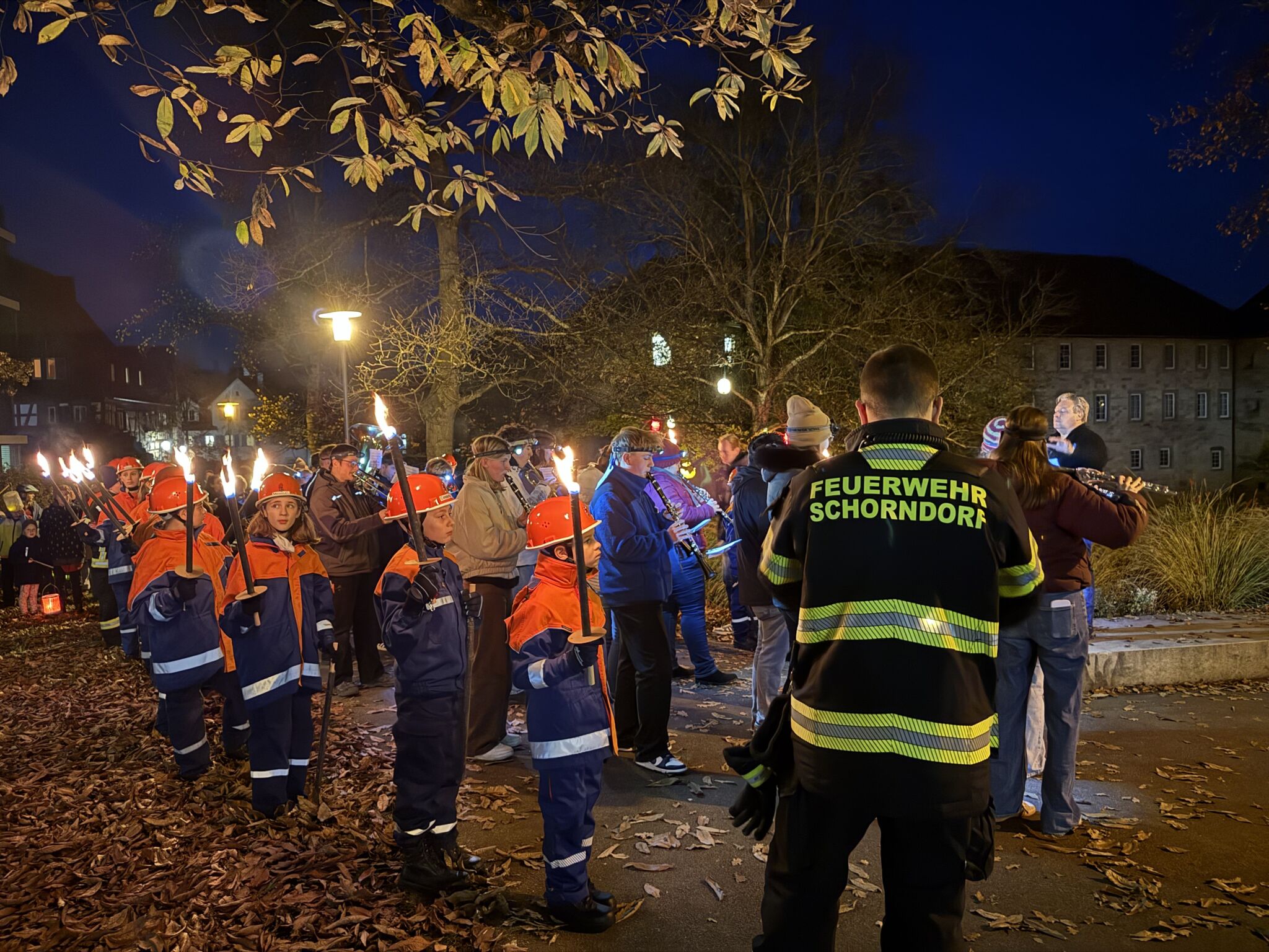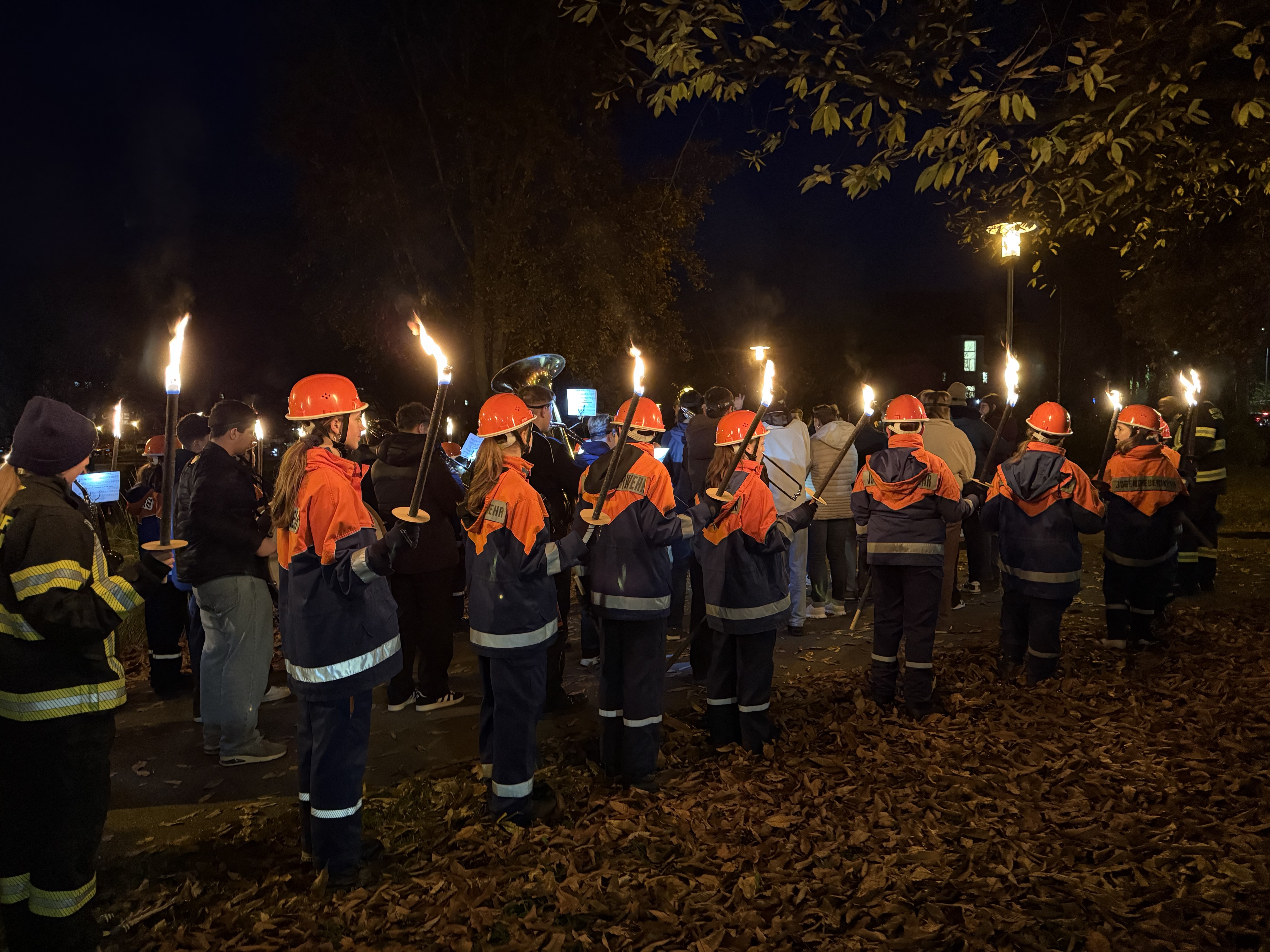 Viele Eltern waren mit ihren Kindern dabei, als die Jugendgruppe der Freiwilligen Feuerwehr Schorndorf, Abteilung Stadt, den Umzug vom Marktplatz über den Burgschloss-Park und zurück über die Höllgasse zum Marktplatz begleitete. Unterstützt von unserem MTW mit Blaulicht und musikalisch untermalt vom Jugend-Blasorchester Schorndorf erstrahlte die Stadt durch die Fackeln und Laternen der Kinder.