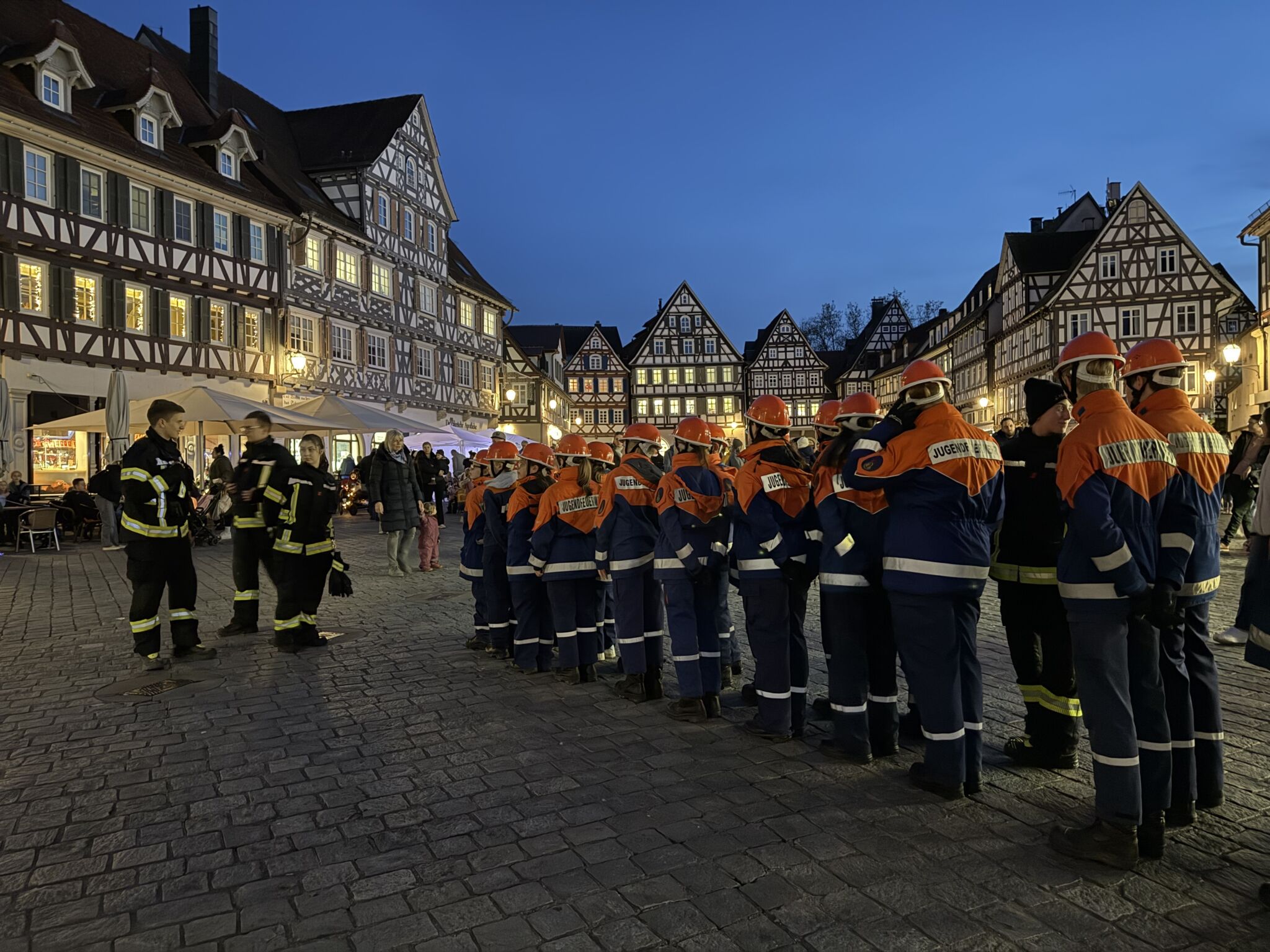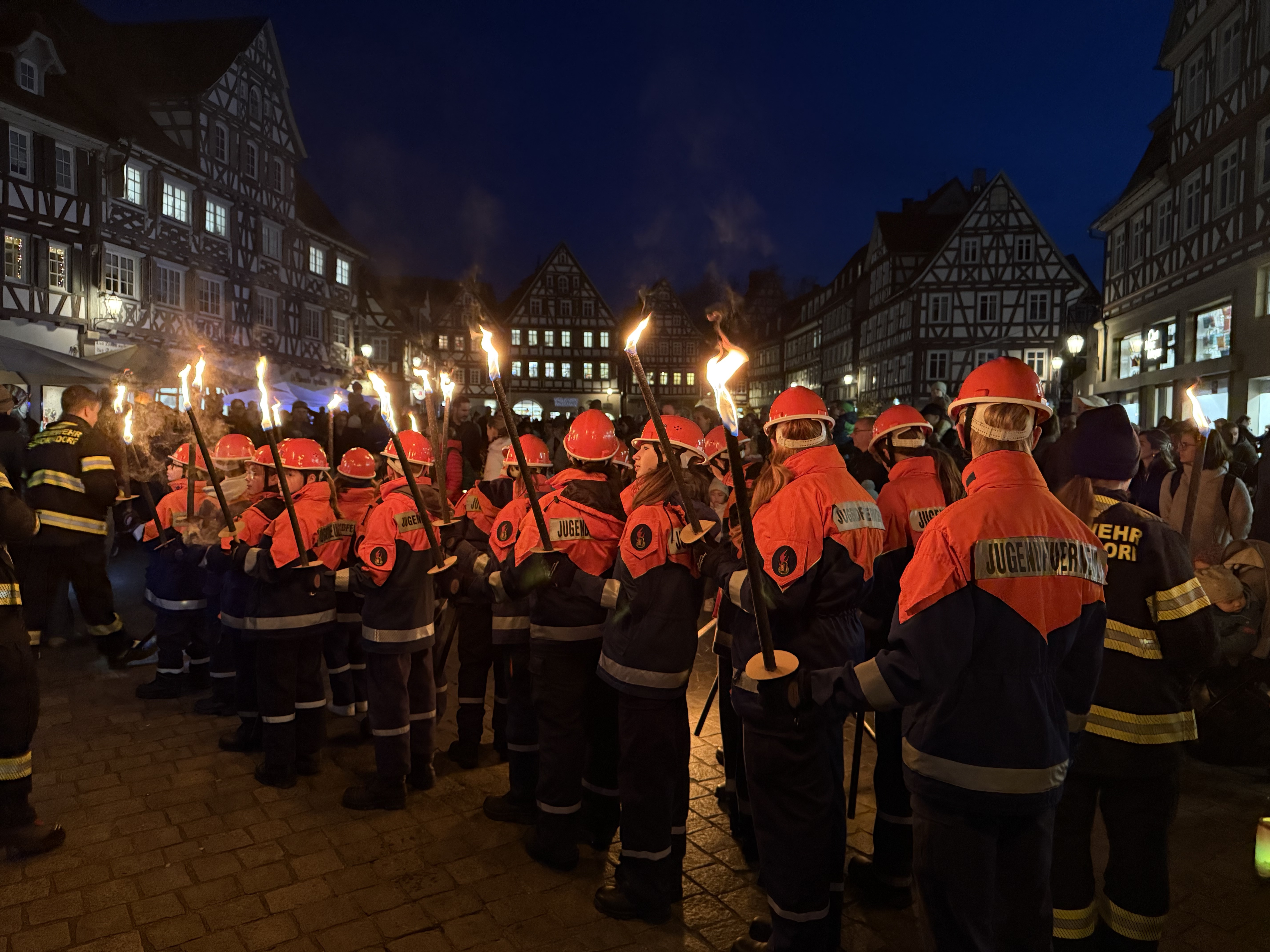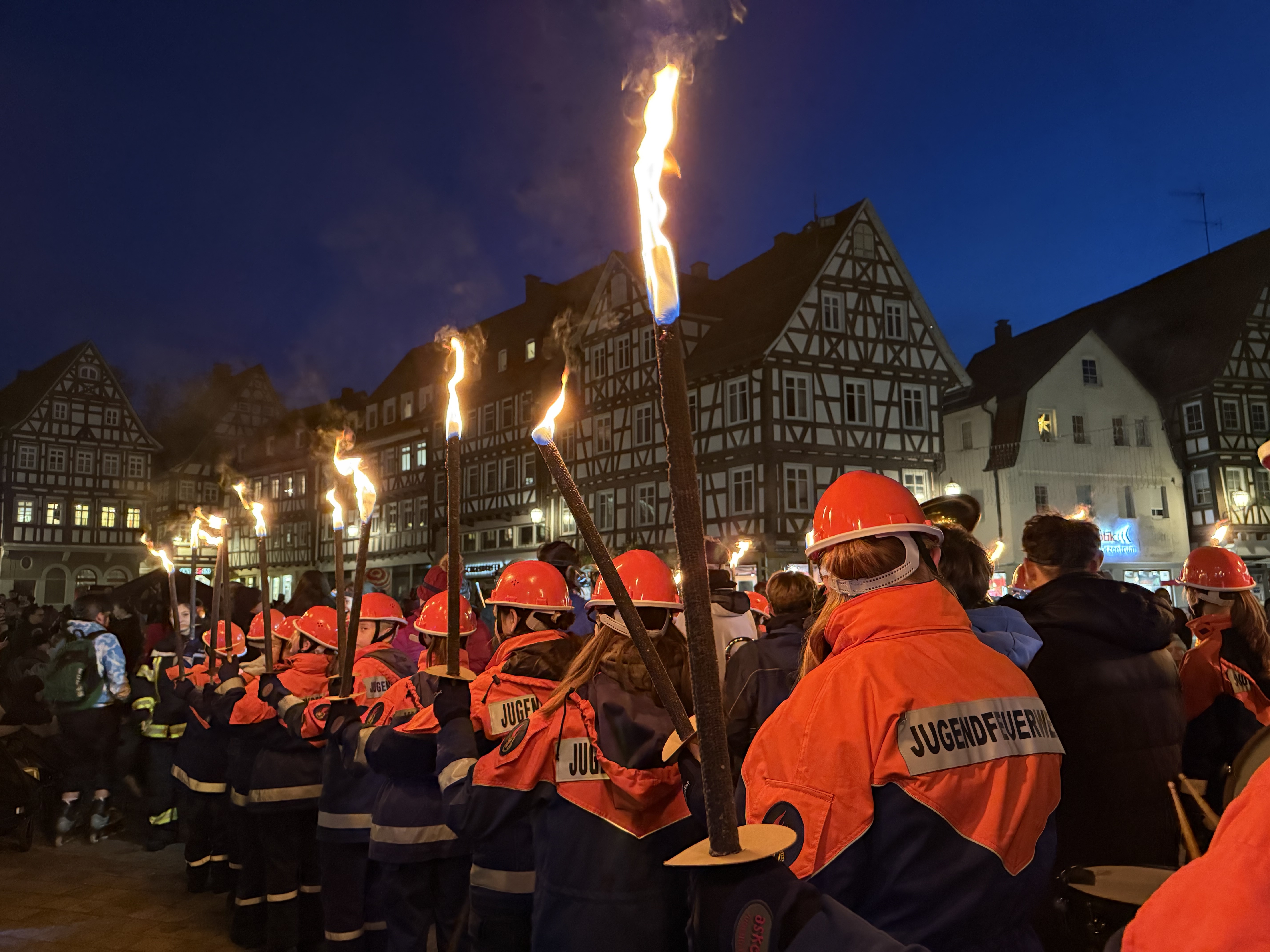 Viele Eltern waren mit ihren Kindern dabei, als die Jugendgruppe der Freiwilligen Feuerwehr Schorndorf, Abteilung Stadt, den Umzug vom Marktplatz über den Burgschloss-Park und zurück über die Höllgasse zum Marktplatz begleitete. Unterstützt von unserem MTW mit Blaulicht und musikalisch untermalt vom Jugend-Blasorchester Schorndorf erstrahlte die Stadt durch die Fackeln und Laternen der Kinder.