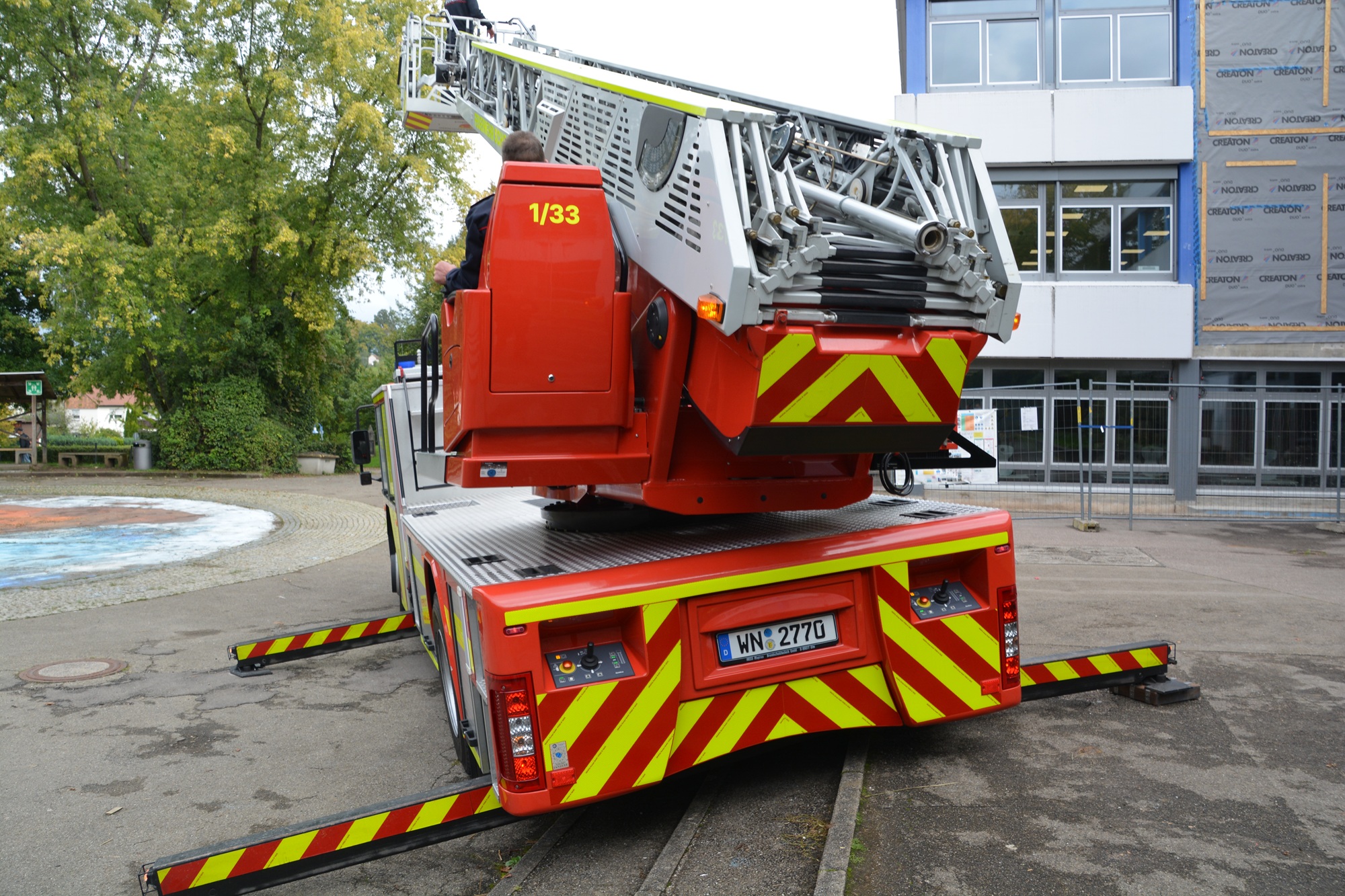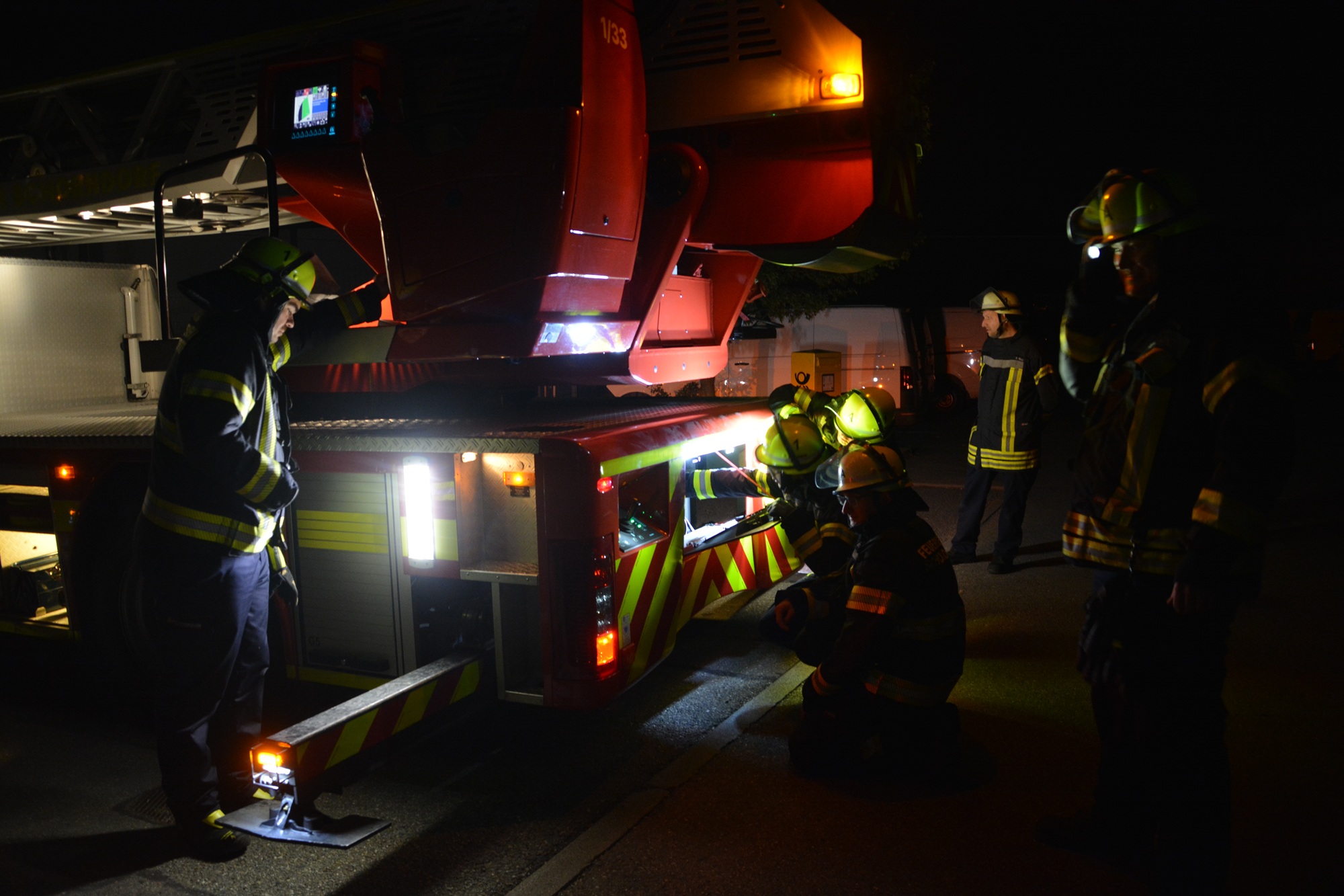 Neben den theoretischen Grundlagen wie Unfallverhütungsvorschriften, Aufgaben der Fahrzeugbesatzung und Baurecht stand die praktische Ausbildung klar im Vordergrund. Bereits am ersten Samstag wurde die Drehleiter vermessen, hierbei wurden Überhänge, Freistandsgrenzen, Fahrzeugmaße, Abstützmaße und weitere Kennzahlen ermittelt.